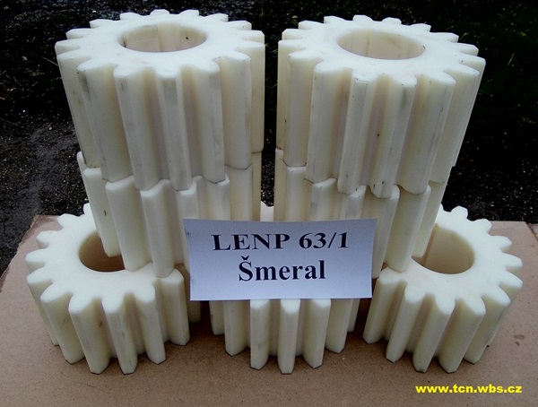 Alkamidový pastorek pro výstředníkový lis LENP 63 - druhá variantaHmotnost : 3,3 kgVenkovní průměr přes ozubení 216mm, vnitřní průměr 90mm, šířka 124mm, drážka pro pero 25mm, modul zubu 12, počet zubů 16.